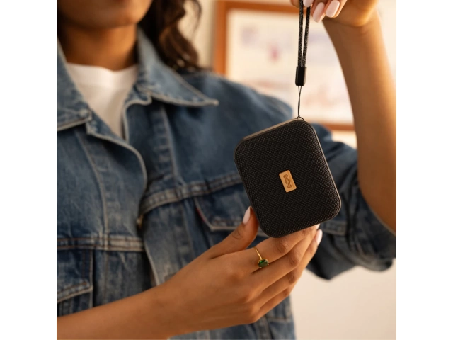 R: Este parlante integra materiales como la tela REWIND™ (algodón orgánico, cáñamo y PET reciclado) y aluminio reciclado, reflejando el compromiso de House of Marley con la sostenibilidad.