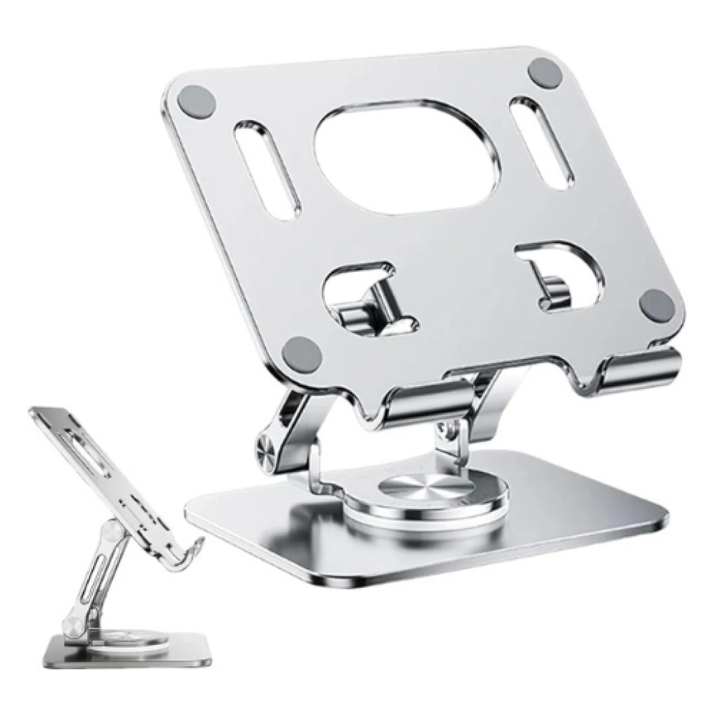 * **Diseño Metálico Robusto:** Fabricado en aleación de aluminio de alta calidad, garantiza durabilidad y una estética moderna que complementa cualquier espacio. * **Rotación 360°:** Gira libremente para compartir tu pantalla o ajustar el ángulo de visión con facilidad, ideal para colaboraciones o presentaciones. * **Altura y Ángulo Ajustables:** Eleva tu dispositivo a la altura ideal de tus ojos, reduciendo la fatiga cervical y promoviendo una ergonomía óptima. * **Ventilación Mejorada:** Su diseño abierto permite una disipación eficiente del calor, protegiendo tus dispositivos del sobrecalentamiento y prolongando su vida útil. * **Compatibilidad Universal:** Apto para la mayoría de tablets y notebooks de entre 10 y 17 pulgadas, con base antideslizante para una estabilidad inquebrantable.