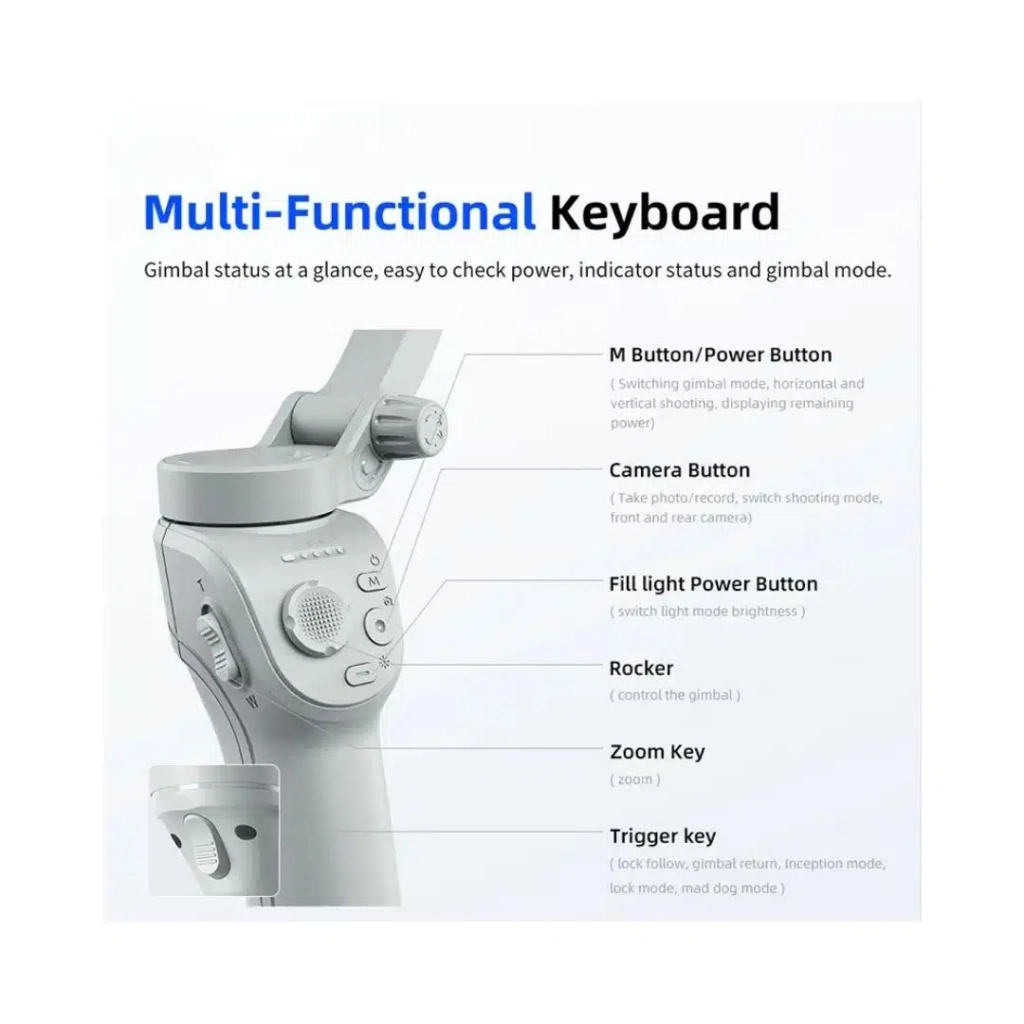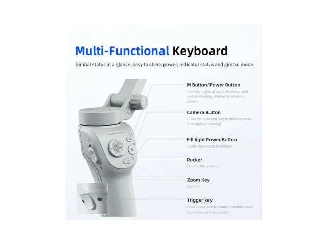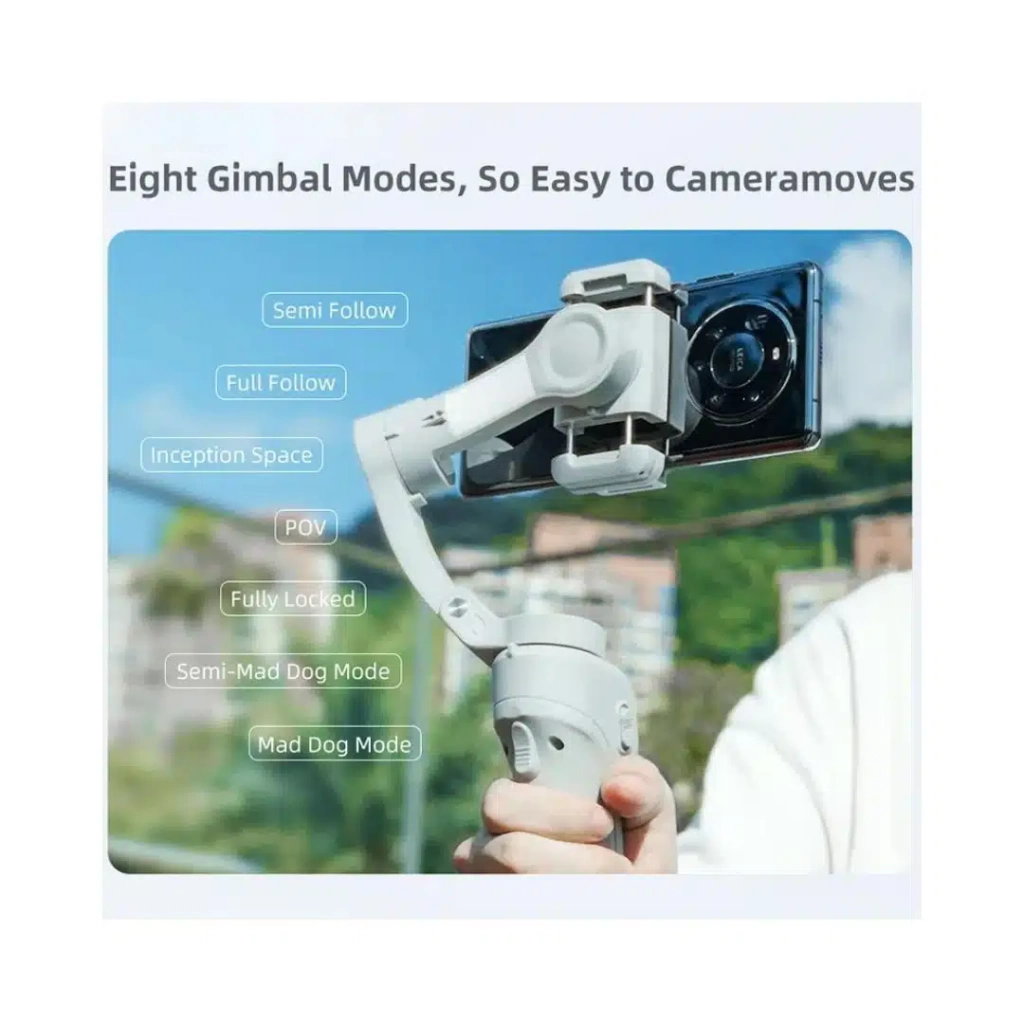 * Estabilización de 3 ejes: Elimina vibraciones y movimientos no deseados para obtener tomas fluidas y profesionales en cualquier situación.* Trípode integrado: Disfruta de la versatilidad para grabaciones estáticas, time-lapses o videollamadas con total comodidad.* Conectividad Bluetooth: Controla tu dispositivo de forma remota, facilitando la captura de fotos y videos sin tocar el teléfono.* Compatibilidad universal: Diseñado para funcionar con la mayoría de smartphones, asegurando que tu equipo actual sea perfectamente compatible.* Diseño compacto y plegable: Llévalo contigo a todas partes sin esfuerzo, ideal para viajes y aventuras.