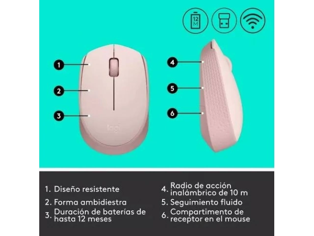 El M170 está pensado para acompañarte. Con una batería que puede durar hasta 12 meses con una sola pila AA (la duración real puede variar según el uso y las condiciones), te olvidarás de los cambios frecuentes. Además, cuenta con un práctico interruptor de encendido/apagado para maximizar la vida útil de la batería. Su alegre acabado en color rosado no solo es visualmente atractivo, sino que también añade un toque de calidez y diversión a tu espacio de trabajo.