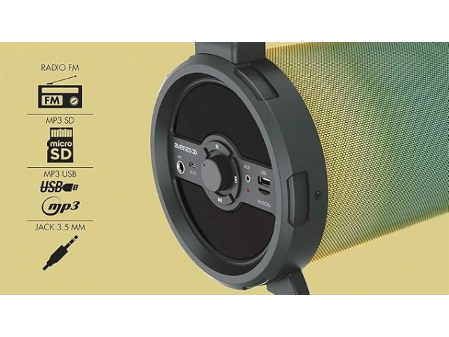 *Disfruta de una conexión estable y rápida gracias a su tecnología Bluetooth 5.0, asegurando que tu música nunca se detenga.*Siente cada nota con sus 5W RMS de potencia, proporcionando un sonido claro y robusto para animar cualquier reunión.*Reproduce tu música favorita hasta por 4-5 horas con una sola carga de su batería de 1200mAh, ideal para aventuras al aire libre o largas jornadas.*Conéctate como prefieras: a través de Bluetooth, USB, MicroSD o cable auxiliar de 3.5mm, ofreciéndote máxima versatilidad.*Crea una experiencia estéreo inmersiva vinculando dos unidades del AV-SP3301B con la función TWS (True Wireless Stereo).*No te pierdas ninguna llamada importante gracias a su función de manos libres integrada.*Sintoniza tus emisoras preferidas con la radio FM incorporada, expandiendo tus opciones de entretenimiento.