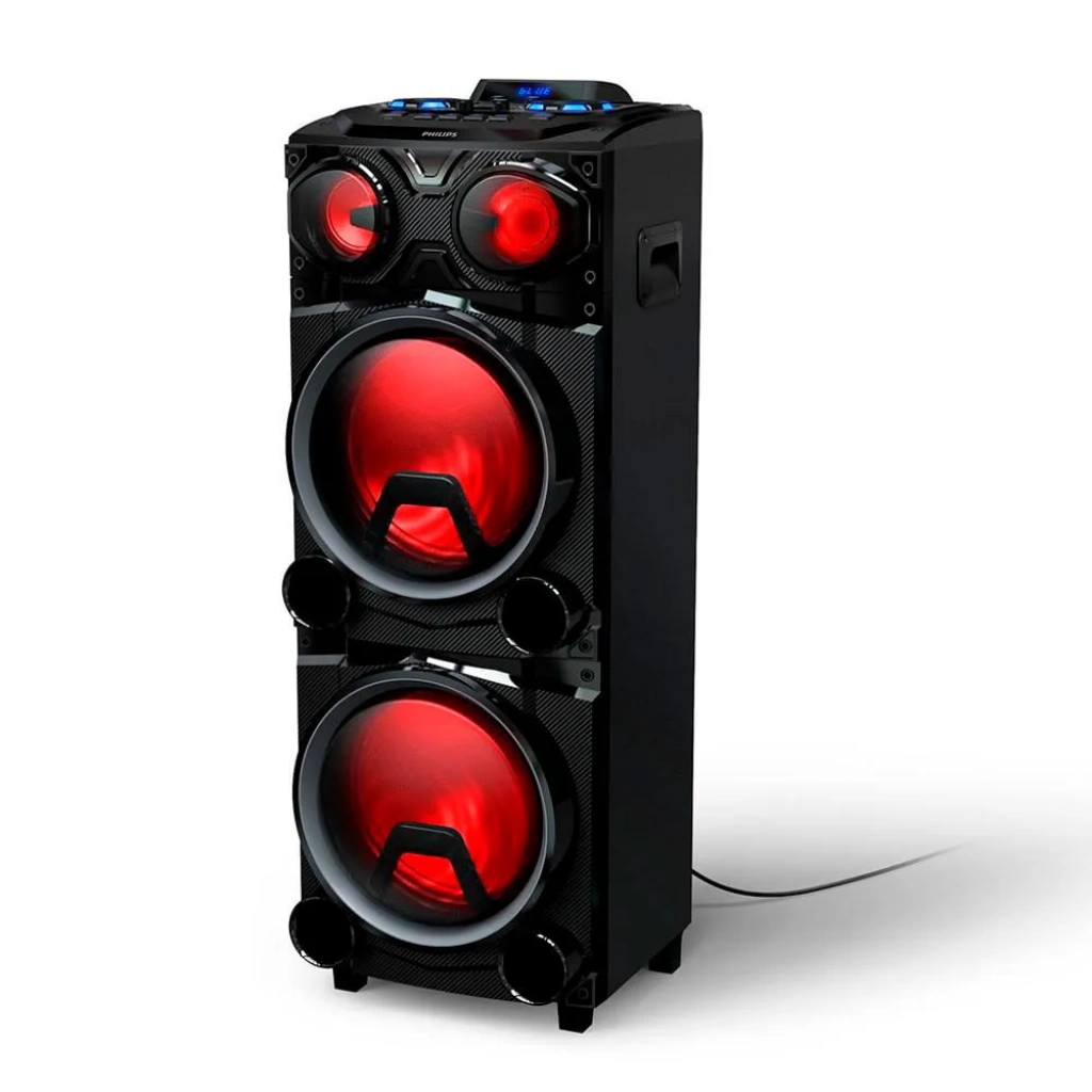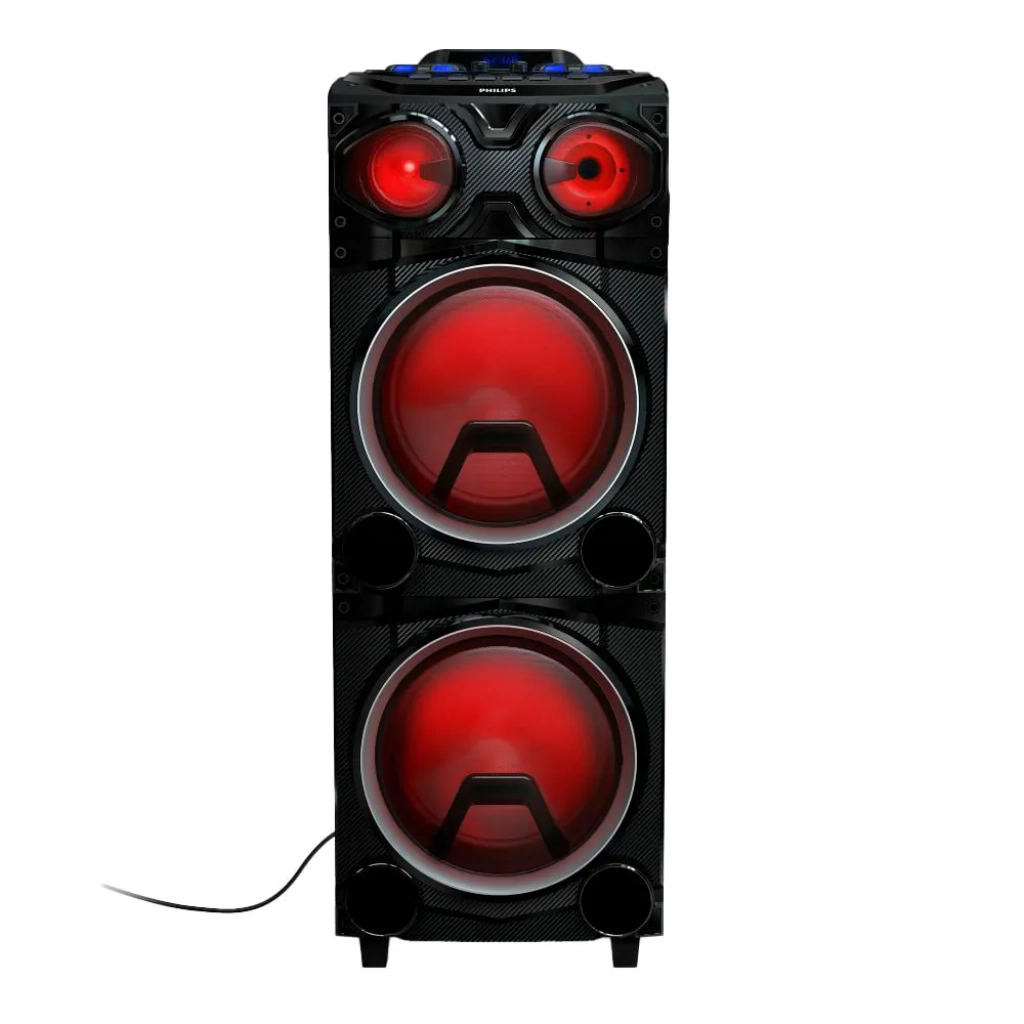 El Philips TAX3705/77 es una torre de sonido ideal para animar cualquier evento. Con una potencia máxima de 200W y doble woofer de 12", ofrece graves profundos y un sonido envolvente. Sus luces LED multicolor sincronizadas con la música crean una atmósfera festiva. Incluye entradas para micrófono y guitarra con controles independientes y efectos de eco, perfectos para karaoke o presentaciones en vivo. Además, permite grabar tus actuaciones directamente en USB o tarjeta SD. Su conectividad Bluetooth v4.2, entradas auxiliares y radio FM garantizan versatilidad. Diseñado para ser transportado fácilmente gracias a su manija y ruedas integradas.​